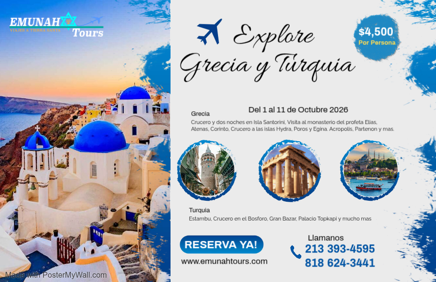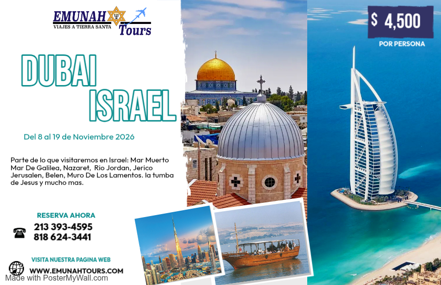 Es tiempo de comenzar a preparar nuestras maletas y decidir viajar este 2026 con Emunah Tours. este año tendrá la oportunidad de viajar a cuatro países diferentes en nuestros dos viajes programados para este año. Nuestro primer viaje lo tendremos del 1 al 11 de Octubre y visitaremos dos hermosas ciudades, la primera sera Estambul allí realizaremos parte de estas actividades: Crucero en el Bósforo, visitaremos el Gran Bazar, el Palacio Topkapi y mucho mas. Posteriormente saldremos para Grecia, aquí disfrutaremos de estas actividades: Crucero y dos noches en la Isla Santorini, visita al monasterio del profeta Elías, Atenas, Corinto, Crucero a las islas Hydra, Poros y Egina, Acrópolis, Partenón. Nuestro segundo viaje sera del 8 al 19 de Noviembre, aquí estaremos visitando la hermosa ciudad de Dubái, en ella tendremos la oportunidad de Visita el Miracle Garden, un emocionante safari por el desierto en un vehículo 4x4, paseo en el tradicional barco Abra, crucero y cena en Dhow Marina, visita a los zocos de las especias y del oro, y mucho mas. Finalmente saldremos para Israel la tierra que sigue fluyendo leche y miel. La Tierra Prometida, aquí algunos lugares que estaremos visitando en este bendecido país. Mar Muerto, Mar de Galilea, Rio Jordán, Jericó, Jerusalén, Belén, Muro de Los Lamentos, la Tumba vacía de Jesús y mucho más. Nuestro cupo es limitado por eso te motivamos a que hagas tu reservación antes del 31 de mayo 2026 y reciba el bono del paquete migratorio y Taza hotelera completamente gratis. Te esperamos en Israel 2026 Shalom Lekulam.